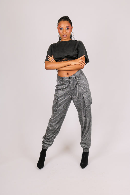 Grey Glitter Cargo Pant With Diamanté Chain