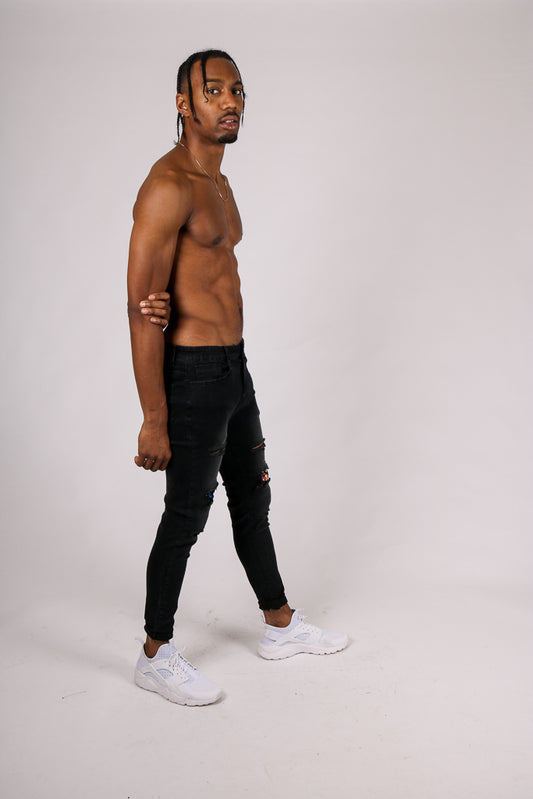 Black Skinny Jean With Knee Rips & Gold Sequin Details