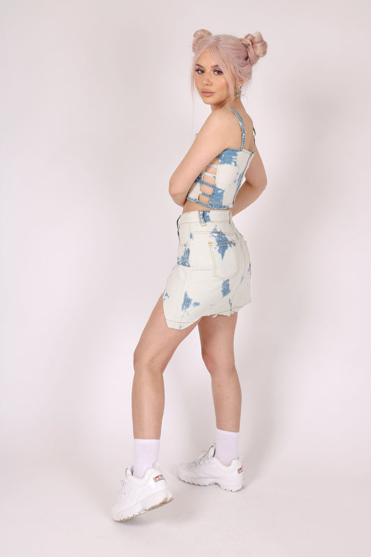 Bleach Wash Denim Mini Skirt With Distressing