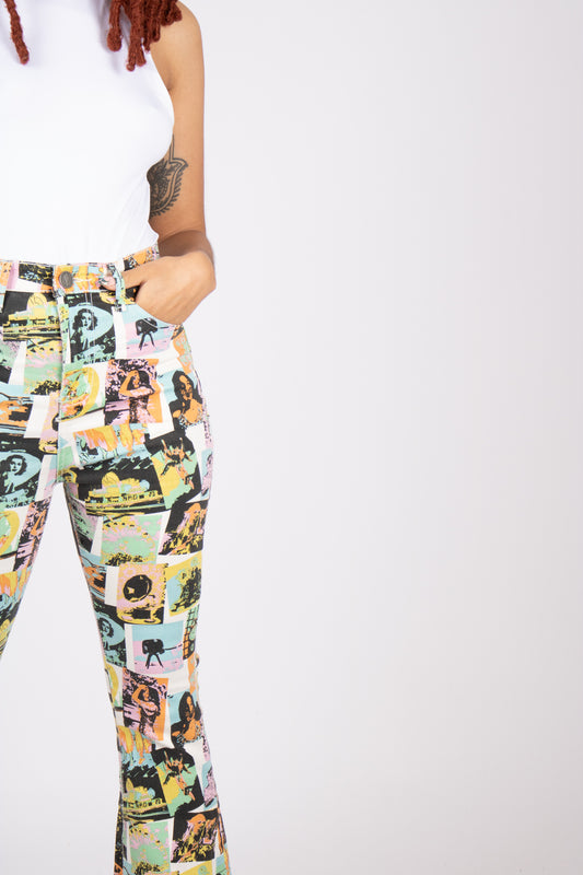 ONE ABOVE ANOTHER High Waisted Faded Newspaper Printed Flare