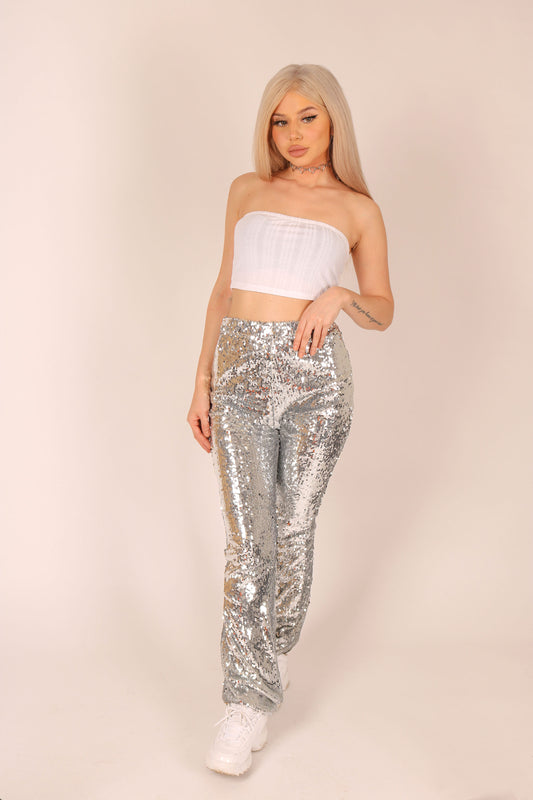 ONE ABOVE ANOTHER Silver Sequin High Rise Flare