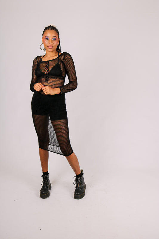 Black Mesh Midi Dress with Lace Up Frontal