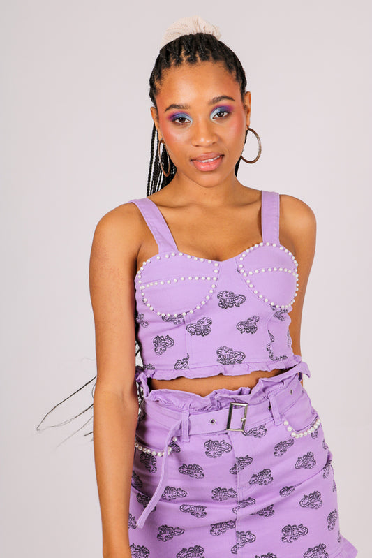 Scorpion Monogram Printed Denim Structured & Pearl Embellished Crop Top
