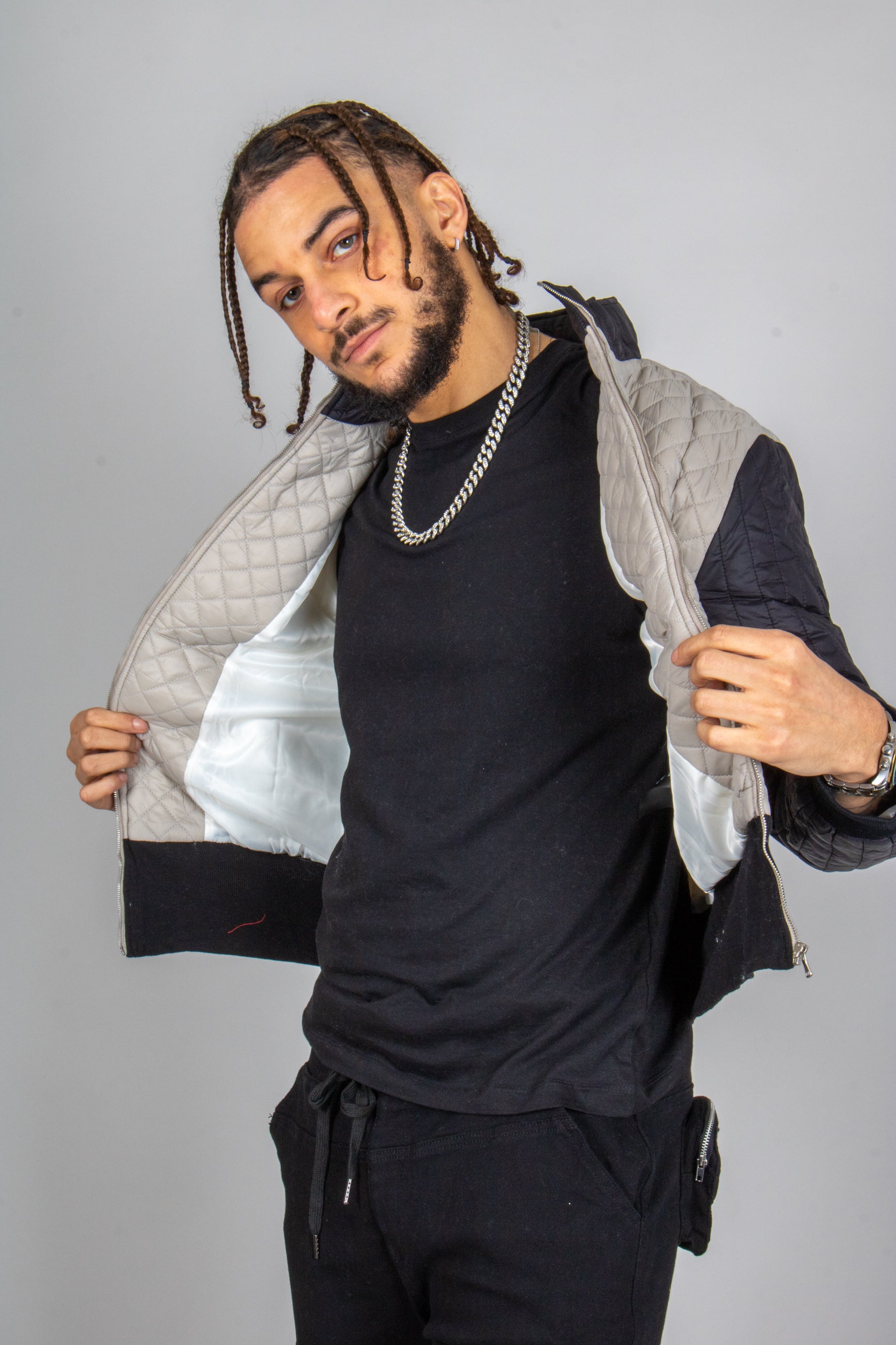 Two tone funnel neck waffle puffer - grey and black with waffle texture for festivals, club nights, and cold days.